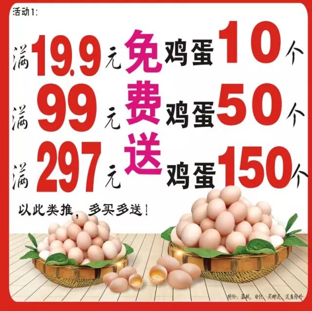 活动期间购满19.9元免费送鸡蛋10个,购满99元免费送鸡蛋50个,购满297元送鸡蛋150个,多买多送!