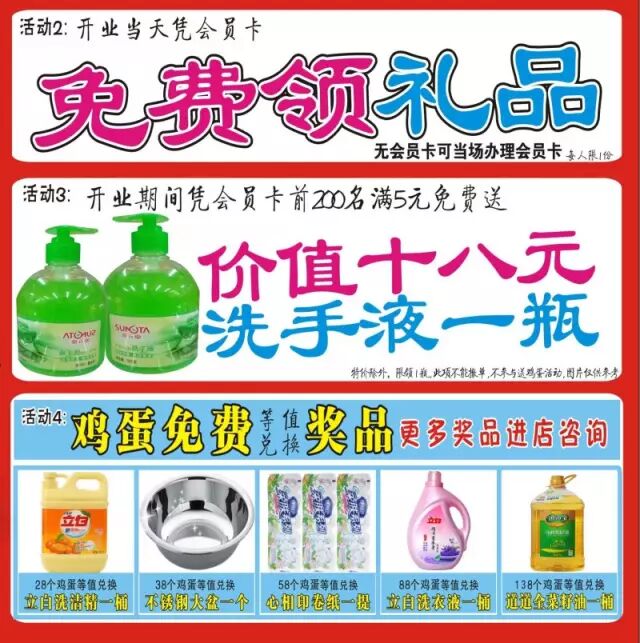 活动期间凭会员卡可以免费领取礼品一份,无会员卡的顾客可以现场免费办理,当天前200名顾客购满5元领取价值18元洗手液1瓶. 如果您不喜欢我们送的鸡蛋,还可以用鸡蛋等值兑换其它您心仪的礼品!